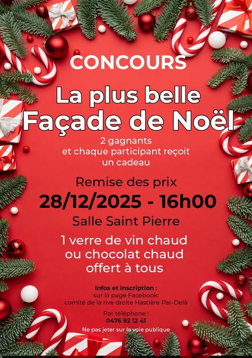 Concours “La plus belle façade de Noël” à Hastière-par-Delà + Ajouter à mon Agenda Google + iCal / Outlook export Date Déc 11 2025 - Jan 04 2026 Chargement... Heure Journée entière Lieu Hastière-par-Delà Organisateur Comité de la rive droite Hastière-par-Delà Partagez cet événement RechercherRechercherArticles récentsCommentaires récentsAucun commentaire à afficher.