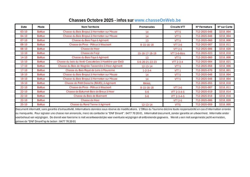 En saison, vous trouverez sur cette page les tableaux des chasses et battues annoncées pour les trois mois de chasse. Il peuvent faire l’objet de modifications et sont remis à jour dès qu’une modification nous est communiquée.