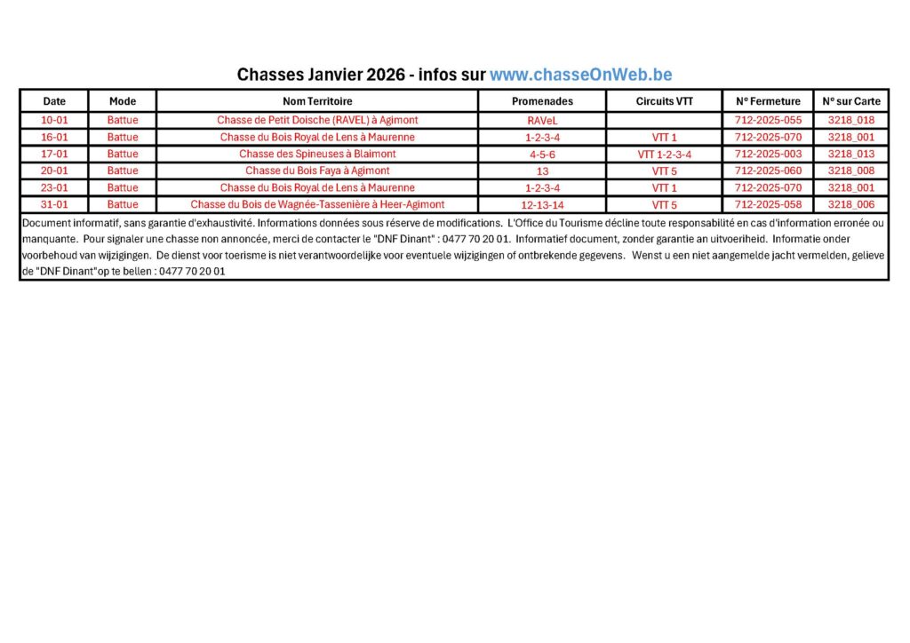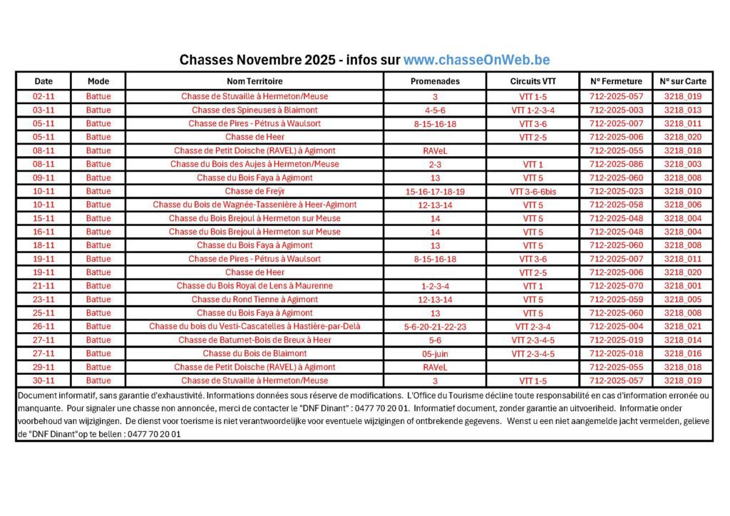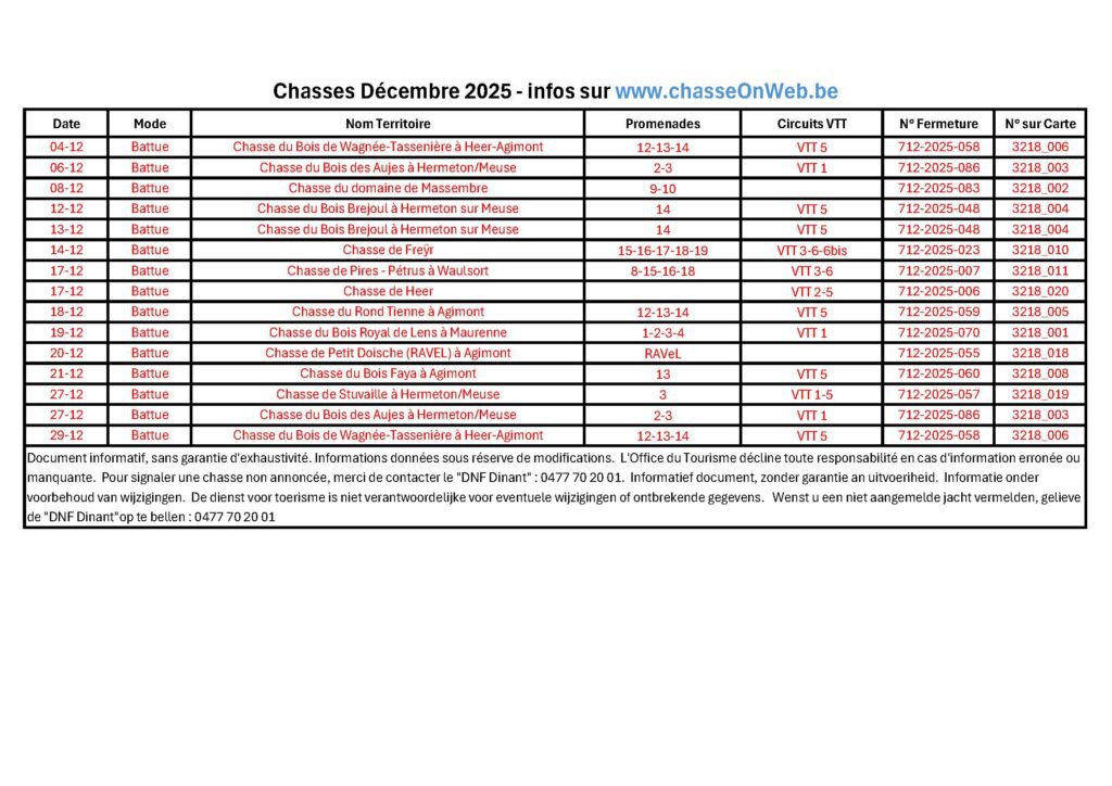 En saison, vous trouverez sur cette page les tableaux des chasses et battues annoncées pour les mois de chasse. Ils peuvent faire l’objet de modifications. Il s’agit donc de documents informatifs, sans garantie d’exhaustivité. Des chasses supplémentaires, exceptionnelles, peuvent encore être programmées en janvier et février.